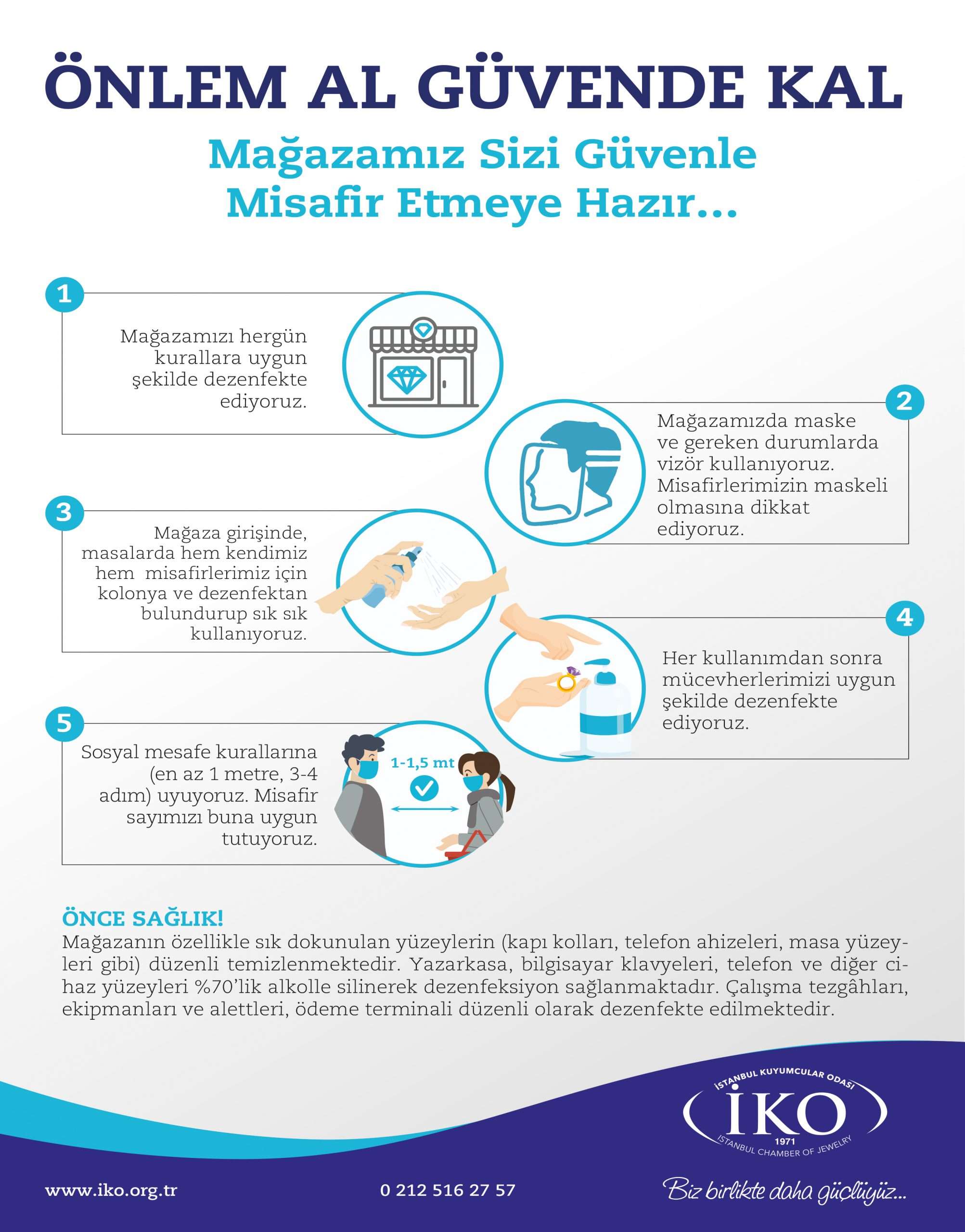 Ülkemizin virüsle mücadelesine destek olmak ve hem müşterileri hem esnafı korumak amacıyla Türkiye’deki tüm kuyumculara tavsiye niteliğinde oluşturulan rehber, İKO’nun kurumsal web sitesinde de yer alıyor.